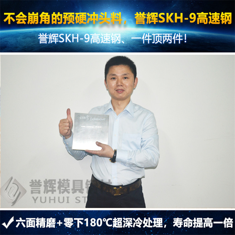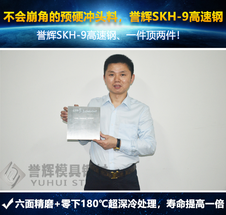 譽(yù)輝SKH-9高速鋼,一件頂兩件。譽(yù)輝模具鋼的預(yù)硬料堅(jiān)持不與同行拼價(jià)格;堅(jiān)持使用正品SKH-9高速鋼,經(jīng)過(guò)光板加工+高壓真空熱處理+超深冷處理+高溫4次回火+六面精磨;陽(yáng)江不銹鋼餐具的五金沖壓模具沖頭多年來(lái),一直選用譽(yù)輝公司的預(yù)硬沖子料SKH-9高速鋼,沖頭壽命增加1倍。廈門(mén)電子開(kāi)關(guān)臺(tái)灣廠(chǎng),選用譽(yù)輝公司的預(yù)硬沖子料SKH-9高速鋼后,模具維修率變低,模具維修人員直接減半。