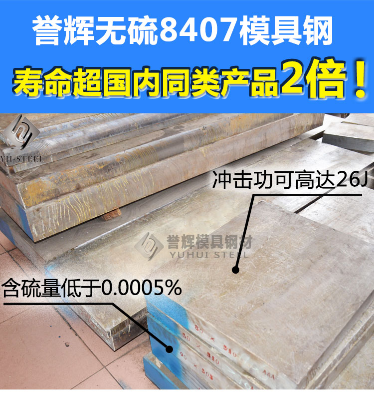 譽(yù)輝無(wú)硫8407模具鋼,采用奧地利INTECO(英泰克)氣氛保護(hù)電渣爐煉鋼,國(guó)內(nèi)僅有2家。鋼中有害雜質(zhì)硫S含量低至0.0005%,國(guó)內(nèi)也許沒(méi)有第二家。譽(yù)輝無(wú)硫8407模具鋼壽命是同行2倍。代表模具壽命長(zhǎng)短的技術(shù)指標(biāo)沖擊功值,同行普遍為10-12J;無(wú)硫8407模具鋼V型橫向沖擊功值達(dá)22-26J。